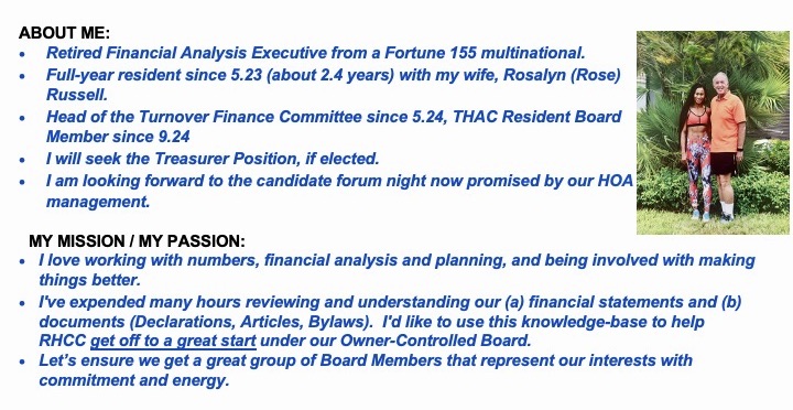 - I’ve expended many hours reviewing and understanding our (a) financial statements and (b) documents (Declarations, Articles, Bylaws). I’d like to use this knowledge-base to help RHCC get off to a great start under our Owner-Controlled Board.